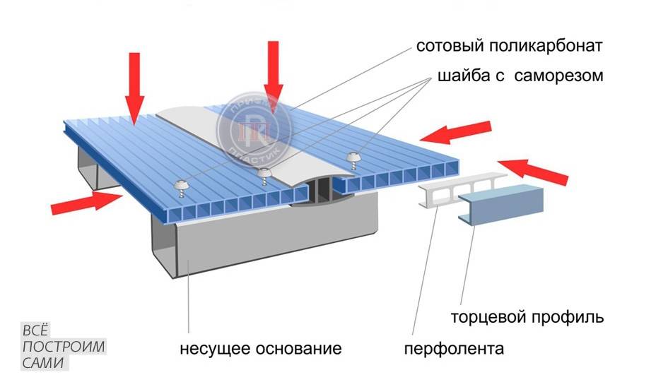 Поликарбонатные листы укладываются защитной пленкой с надписью вверх. К каркасу крепятся саморезами с термокомпенсационными шайбами. Шаг саморезов около 30 см. Предварительно в поликарбонате сверлится отверстие диаметром примерно на 2 мм больше, чем диаметр самореза. Саморезы закручиваются не до упора. Лист должен иметь возможность двигаться при перепадах температур. Крепление профиля разборного начинается с крепления его нижней части. Затем в нее вставляется край листа и только после этого крепится верхняя часть разборного профиля. Все швы герметизируются силиконовым герметиком. При длине листов, равной скату крыши, отпадает необходимость герметизации стыков. Герметик используется только для обработки стыков между соседними листами. При использовании поликарбонатных каркасных элементов и эта необходимость отпадает, так как стыки закрываются специальными накладками, обеспечивающими герметичность. Защитная пленка с надписью снимается с собранной из поликарбоната крыши в последнюю очередь.