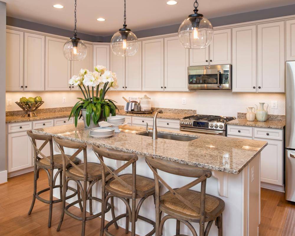 На кухне в частном доме нормальной площади можно расположить у окна рабочую поверхность и все важные узлы: раковину, плиту. Также туда отлично встанет обеденный стол.