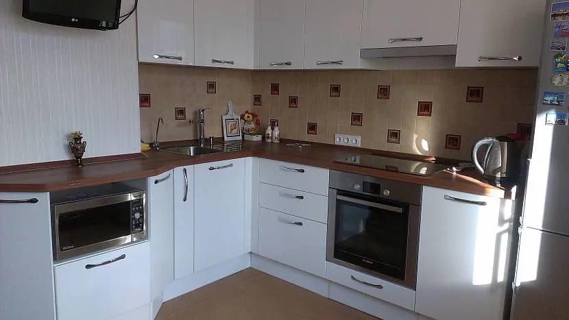 Если площадь помещения позволяет, отдельные элементы делаются достаточно объемными – для кухонь с эркером или совмещенных с утепленным балконом это вполне приемлемо. Тогда столешница плавно огибает короб, переходя в подоконник или образуя барную стойку. При расположении короба в одном из углов, рекомендуется ставить кухню вдоль одной стены, предпочтительно более длинной. Г-образный гарнитур подойдет для совсем маленькой кухоньки, архитектурный выступ тогда оформится неглубоким напольным шкафчиком, таким же подвесным, имеющим, большей частью, декоративное назначение. Реже короб «прячется» полностью за дверцами одного из шкафов-пеналов, но целесообразность такого элемента вызывает множество вопросов.