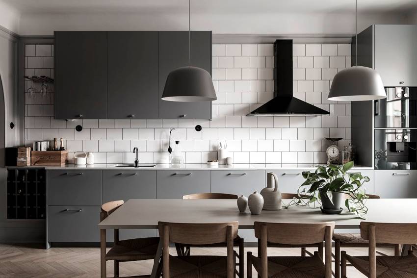 - Универсальность. Светлые оттенки серого выгодно смотрятся в интерьере небольшой кухни, объемы которой визуально расширяются, а темные тона можно удачно использовать в большом помещении.