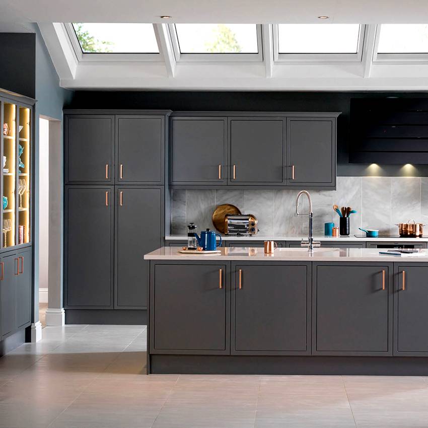 Пример современной серой кухни с матовыми фасадами и столешницей под дерево: