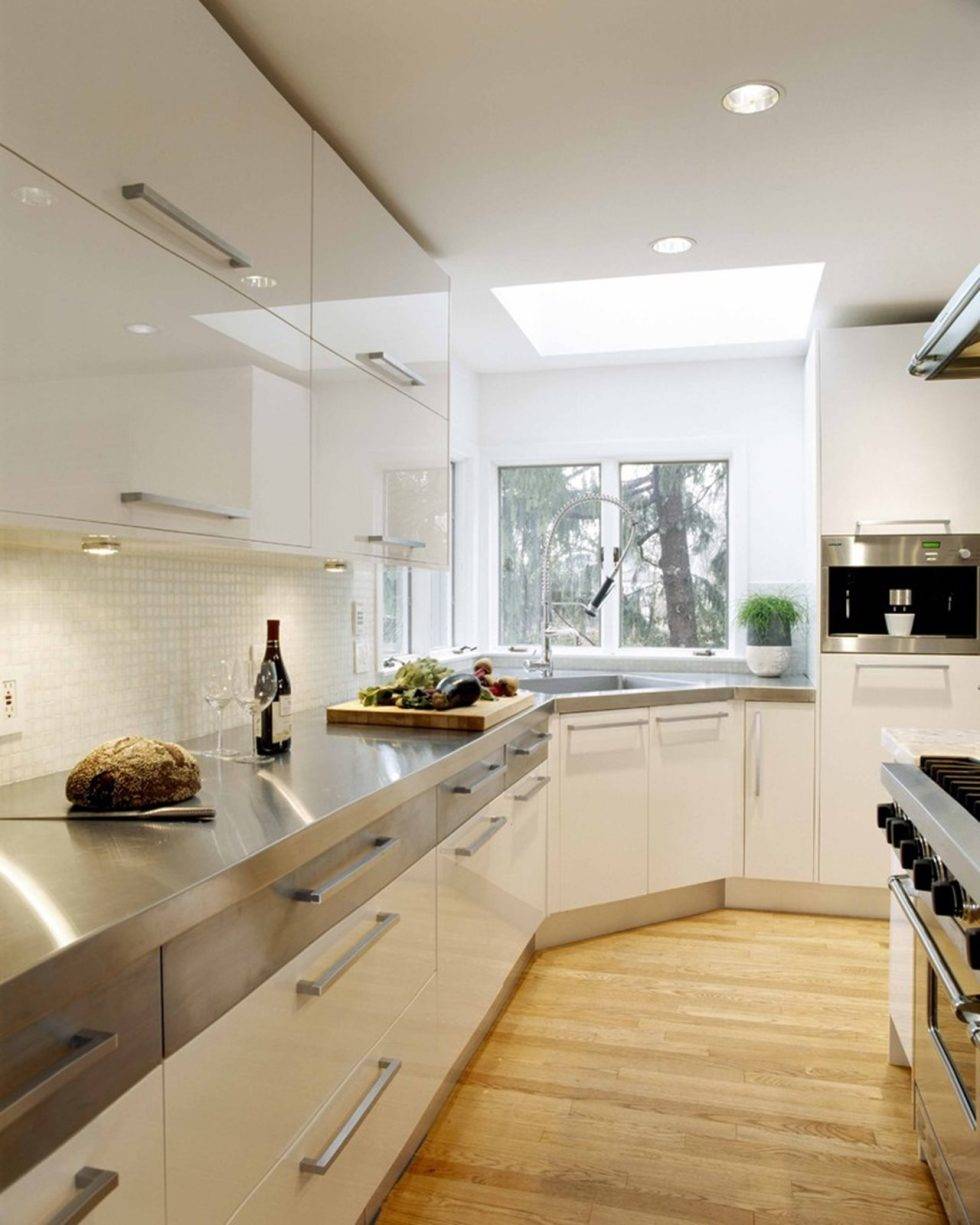 А вот потолок желательно сделать максимально светлым, такой подход не принесет вреда интерьеру, но значительно и положительно повлияет на ощущение данного пространства. То же касается кухонного окна, не желательно «играть» со слишком темными, насыщенными тонами, пусть оно пропускает больше света. Тогда и шторы придется подобрать не тяжелые, портьеры или занавески не желательны. Лучше римские, рулонные шторы, жалюзи пастельных цветов.