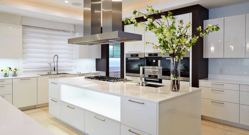 Белые кухни хай-тек даже со временем не теряют своей актуальности. При этом интерьеры не выглядят скучно или однообразно. Это не значит, что нельзя разбавить дизайн кухни хай-тек белого цвета дополнительными деталями: