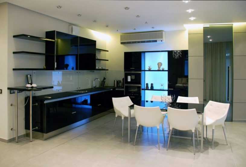 Главное требование в оформлении — использование инновационных материалов отделки и техники, хромированные элементы мебели и контрастные оттенки.