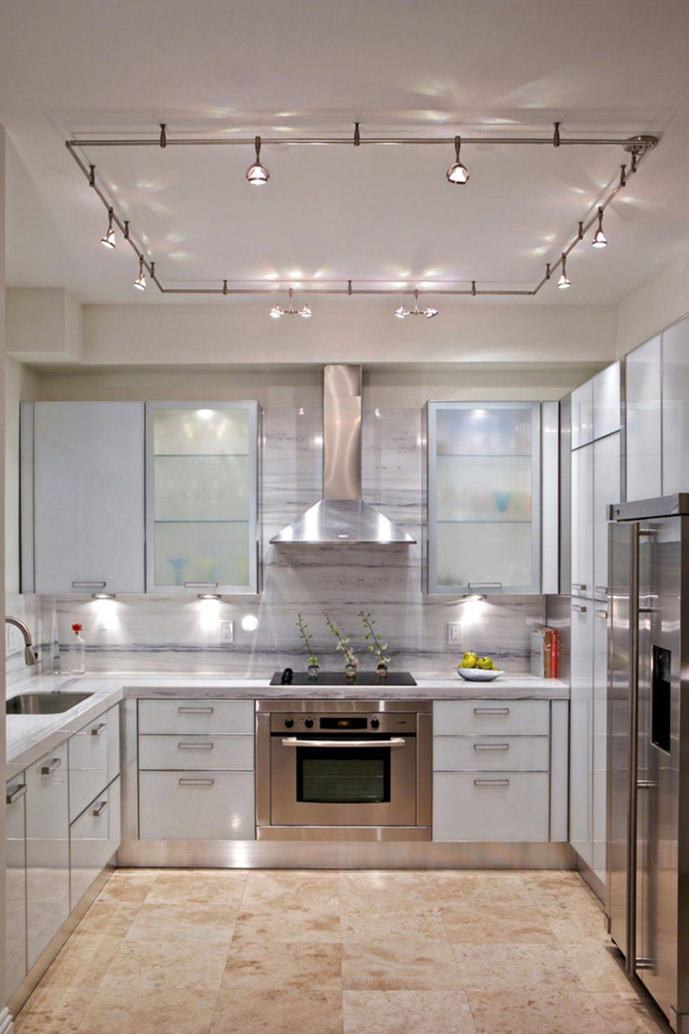 Самое лучшее решение для хай-тек кухни – точечное освещение на потолке, свет над рабочими поверхностями и прожекторный свет, направленный на плиту и обеденный стол.