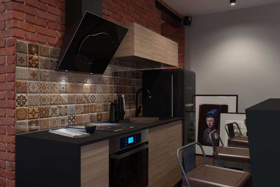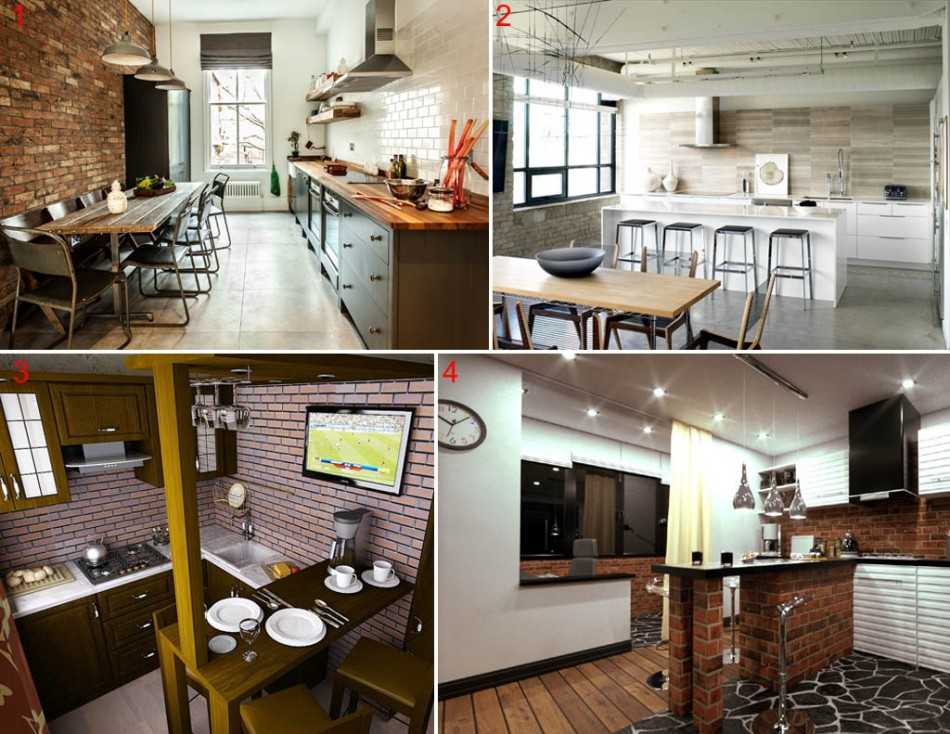 Отличительным элементом декора на кухне считается кирпичная стена, но не следует выполнять из этого материала все стены в помещении. Также не рекомендуют использовать кирпич для оформления фартука для кухни лофт, потому как за ним сложно ухаживать. Значительно практичнее использовать керамическую плитку, а также можно на стену наклеить обои с рисунком, имитирующим кирпичную кладку, и закрыть их прочным стеклом, которое легко поддается уходу. Плитку следует подбирать таким образом, чтобы она гармонично сочеталась с общим фоном квартиры и не привлекала к себе излишнего внимания.