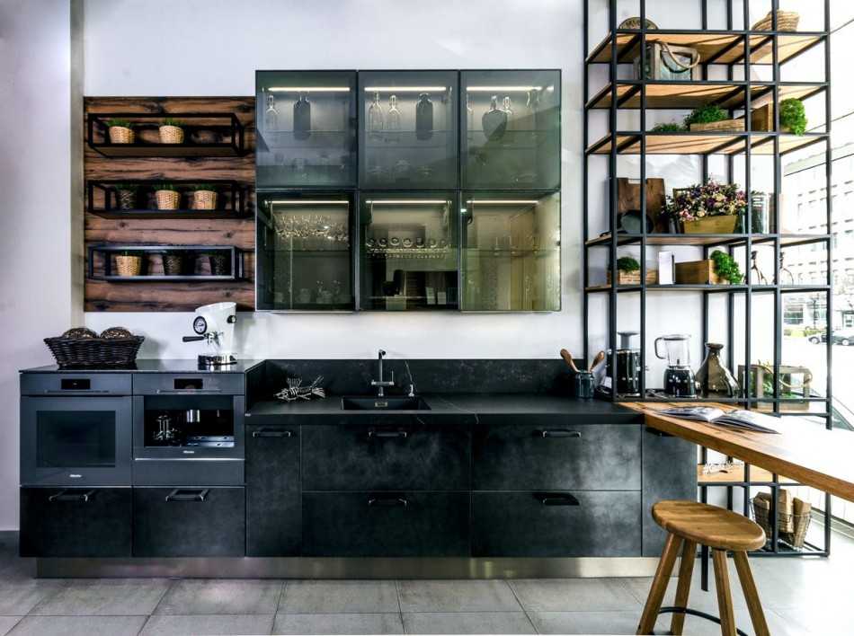 Стильно и эффектно смотрятся в интерьере кухни-гостиной или кухни-столовой в стиле лофт стеклянные перегородки в черных рамах.