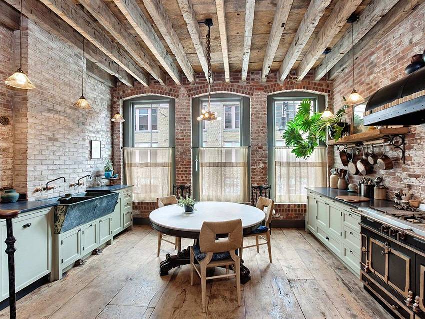 Отделать потолок кухни в стиле лофт можно деревянными балками или трубами