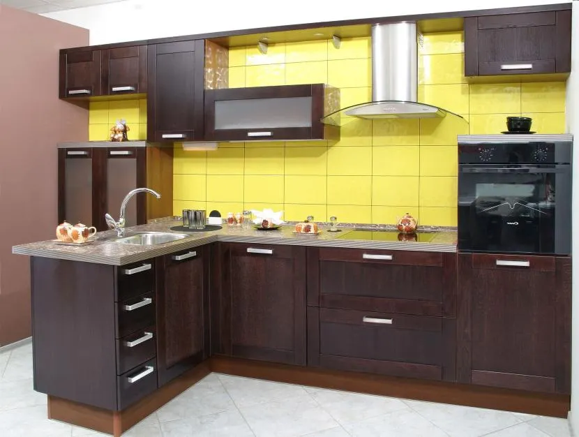 Отделка рабочей поверхности в стиле венге сочетается с правильно подобранным кухонным гарнитуром L-образной формы.