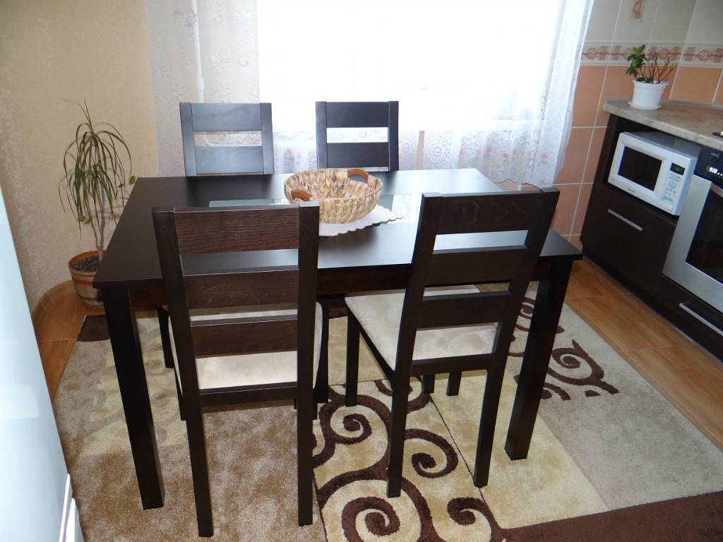 Обеденная группа предполагает сочетание тех же цветов в разных вариантах. Светлую поверхность пола эффектно подчеркнут темные ножки стульев, а дополнительным цветовым акцентом послужит светлая поверхность столешницы.