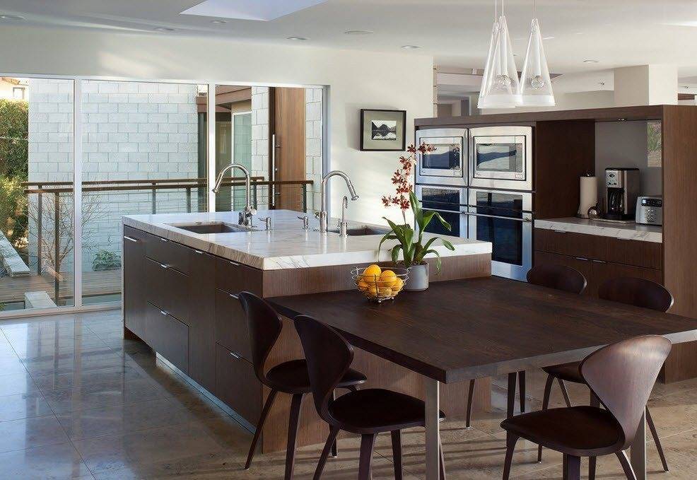 Какой бы стиль или цветовое решение не было выбрано для дизайна с использованием древесины в кухне венге помещение всегда будет смотреться уютно и современно. К тому же темные оттенки всегда считаются очень практичными. Главное: внимательно продумать каждый элемент кухни, отделочные материалы.