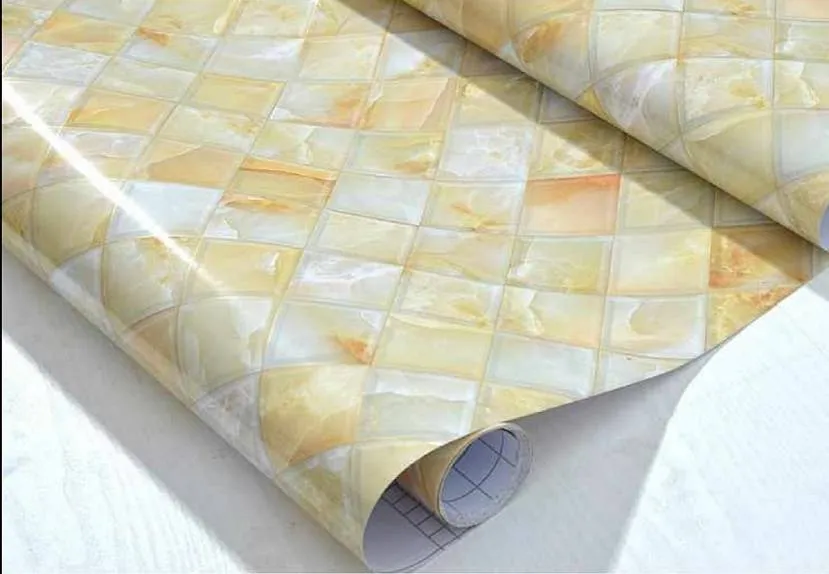 Лицевая сторона материала сделана из ПВХ, изнанку покрыли специальным клеем. Принцип монтажа такой же, как и у стикеров. По ширине пленка в рулонах бывает 45 и 90 см. Благодаря размерам можно быстро спрятать обветшалый кафель, создав новый дизайн.