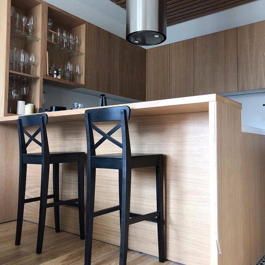 - при отсутствии функциональных ящиков под барной стойкой появляется возможность задвинуть туда стулья, это существенно сэкономит полезное пространство.