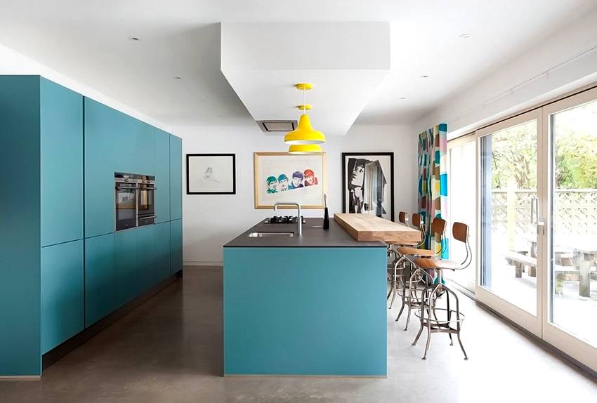 Фото 8. Барная стойка замыкает пространство, отведенное под кухонную зону, тем самым ограничивая его визуально. Контрастный цвет мебели подчеркивает это разграничение и придает дизайну помещения законченность и графичность.