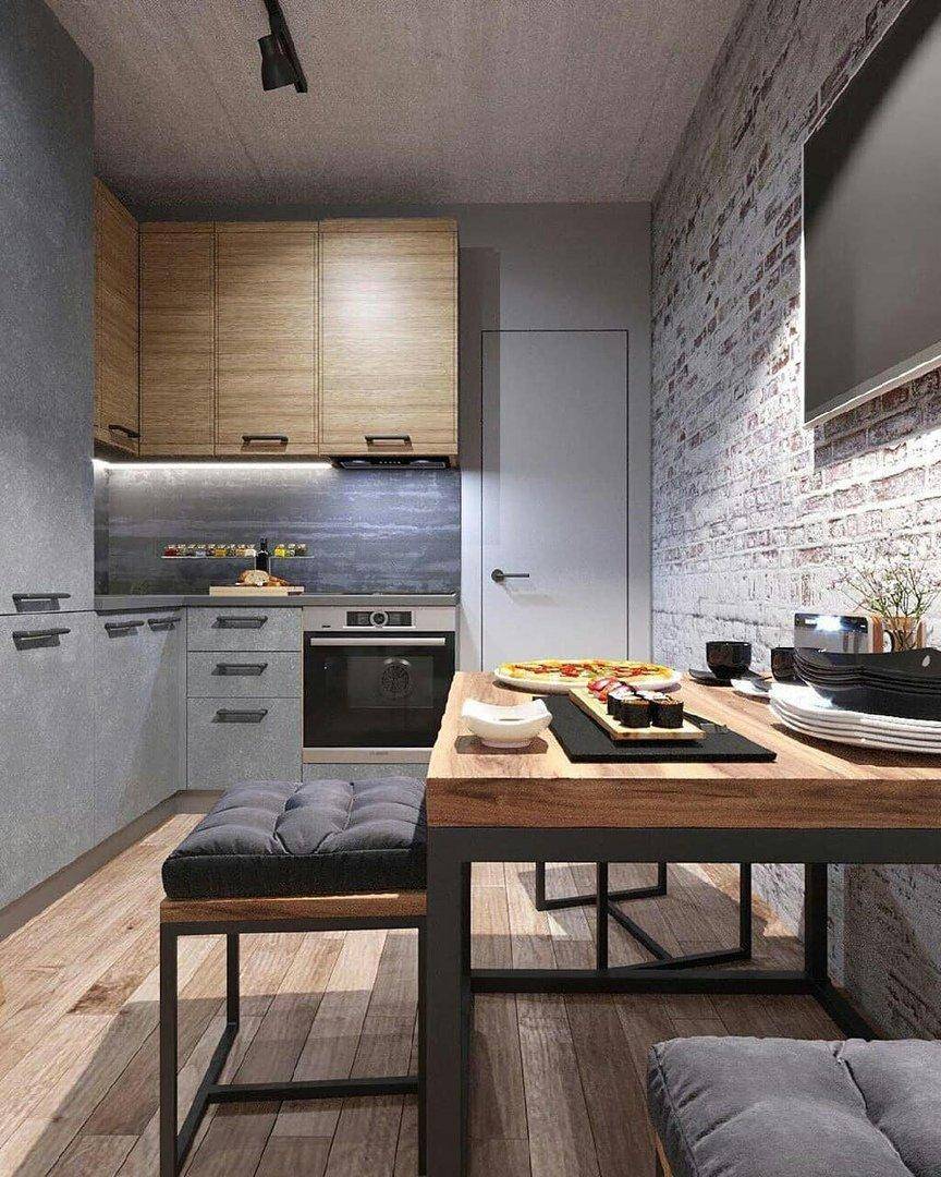 Барная стойка в этом случае будет выполнять две функции — рабочей и обеденной зоны. Компактное расположение мебели позволяет расположить все необходимое на минимальной площади.