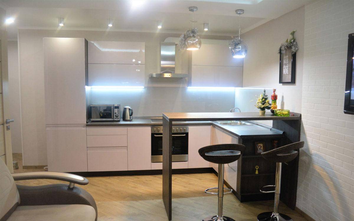 Гарнитур с барной стойкой в стиле хай-тек оформляется в максимально простом стиле, в строгих формах и с неброской фурнитурой. Главная отличительная черта стиля — обилие световых приборов, которые создают неповторимый дизайн.