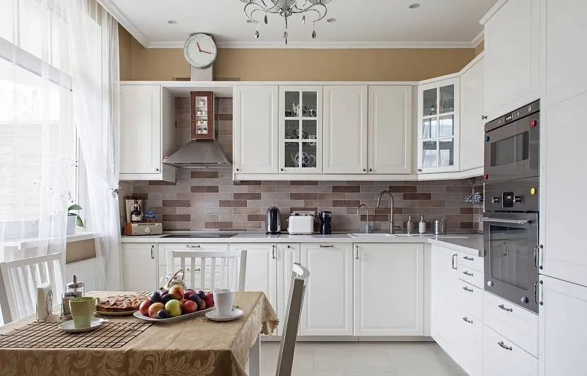 Такой стиль подойдет для почитателей сдержанности, богатства и роскоши. Классическая угловая кухня выполняется в выдержанных цветах, которые имитируют дерево. При этом столешницы монтируются из натурального или искусственного камня. Фасады шкафов могут быть из цельного полотна или скомбинированы со стеклянными элементами.