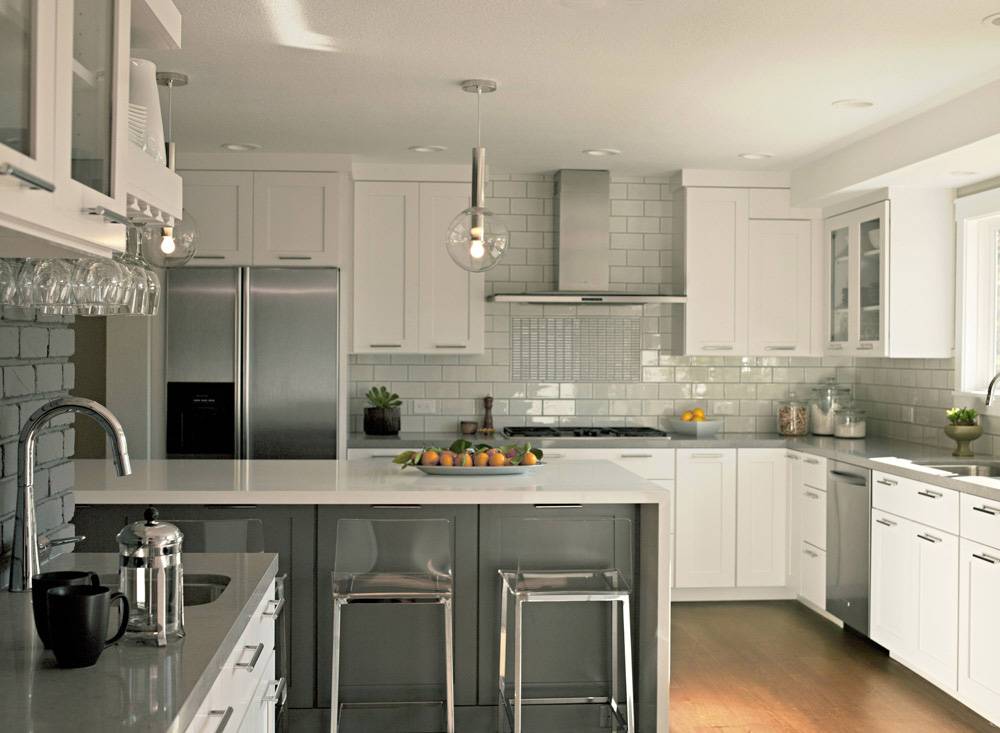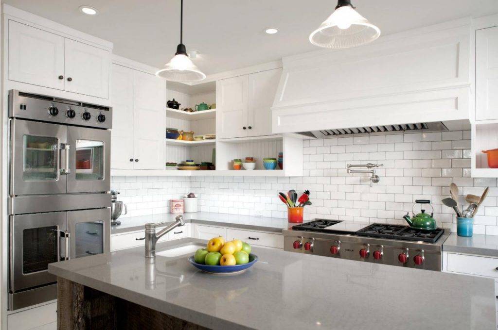Большие помещения предоставляют неограниченный простор для кухонной мебели и техники в Г-образной форме. Окончательный результат будет зависеть от бюджета проекта, а также стилистического оформления.