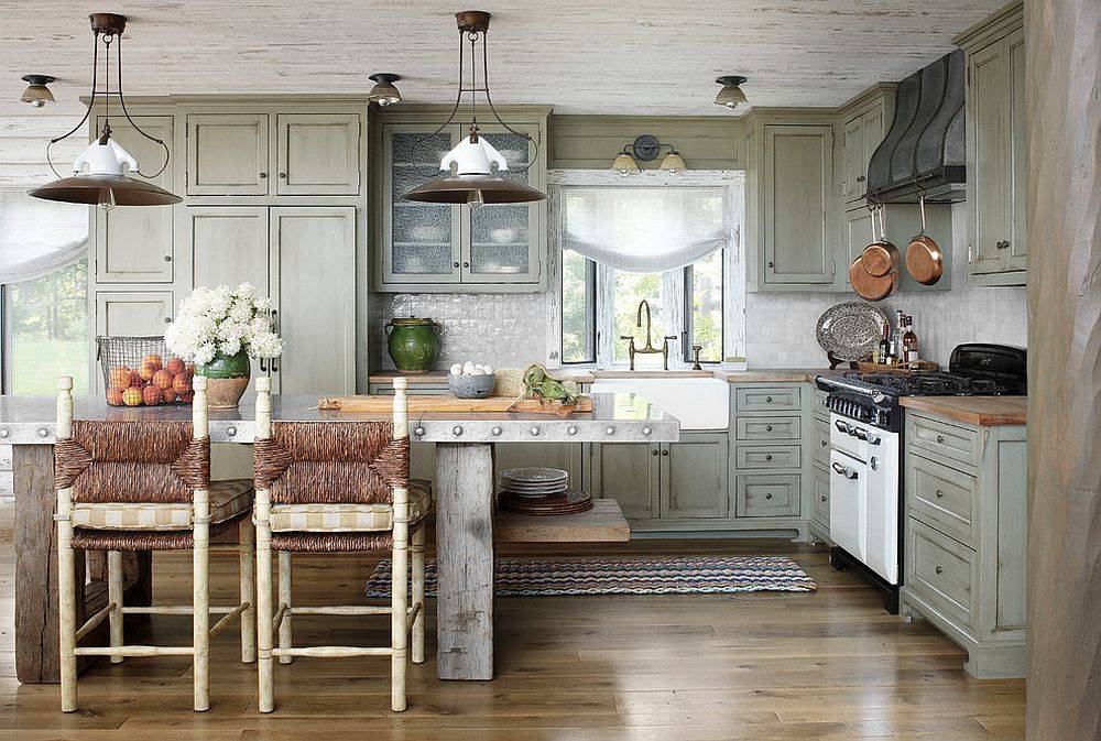 Основной идеей этого направления является переплетение старинного быта и современности. В интерьере присутствуют только теплые оттенки, которые дополняются изобилием стекла с резными акцентами. Кухня в таком стиле наполняет дом гармонией, уютом, который сочетается с современной техникой и посудой.