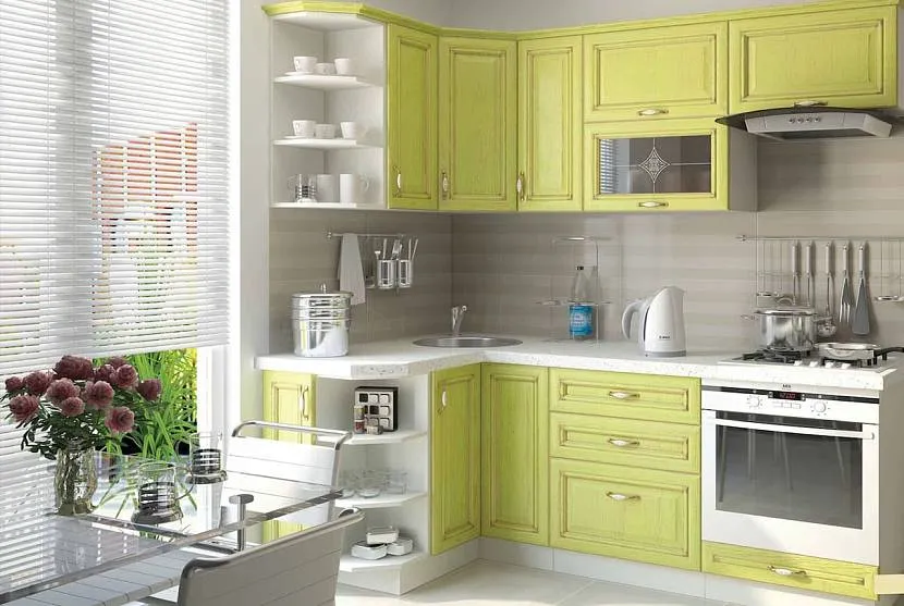 Фасад угловой кухни цвета лаймаИсточник designmyhome.ru