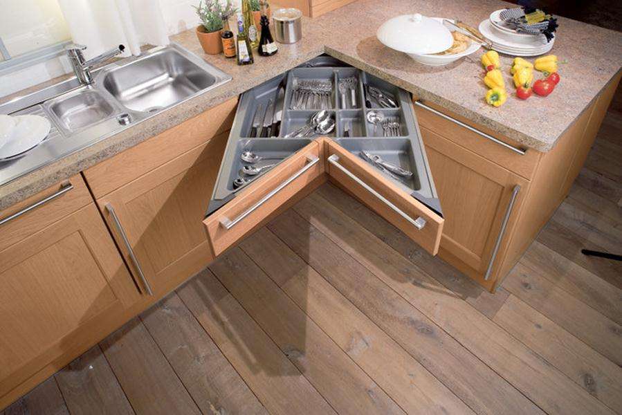Условно угловые кухни разделяют на гарнитуры с прямым и скошенным углом. У скошенного угла есть свои преимущества: во-первых, лучший доступ ко всем элементам, здесь не требуются особые выкатные или выдвижные механизмы. Во-вторых, скошенные модули более вместительные, в-третьих, их можно расположить рядом с плитой или мойкой – тогда и доступ к этим предметам обстановки будет свободным.