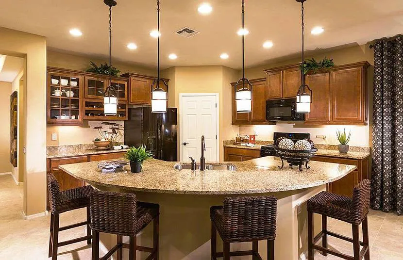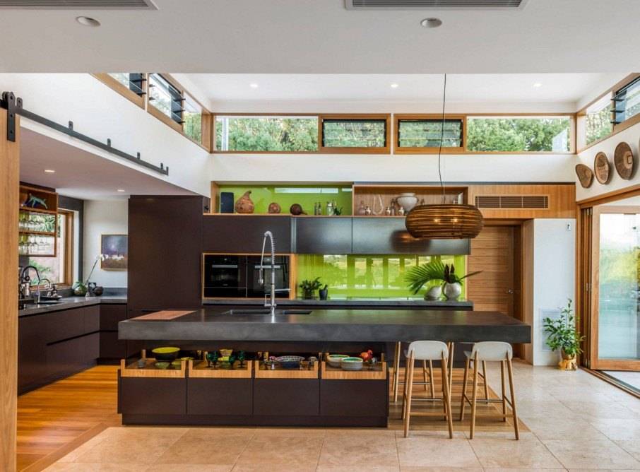 Традиционно, при моделировании частного дома стараются выделить достаточное пространство для кухонного гарнитура. Просторное помещение позволяет разместить остров на кухне. Это не столько дань моде, сколько возможность функционально дополнить мебельный гарнитур. Кухня — активная зона дома, где не только готовится пища. Зачастую не только повседневный приём пищи, но и дружеские посиделки проходят именно в этой комнате.