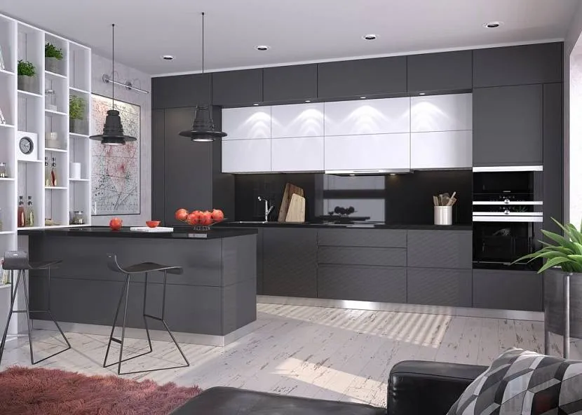 Используй самые современные варочные поверхности, неоновую или светодиодную подсветку, стекло и причудливые барные стулья футуристического вида. Над островом стильно смотрится отдельная потолочная конструкция с точечными или подвесными светильниками: она создает иллюзию парящего блока.