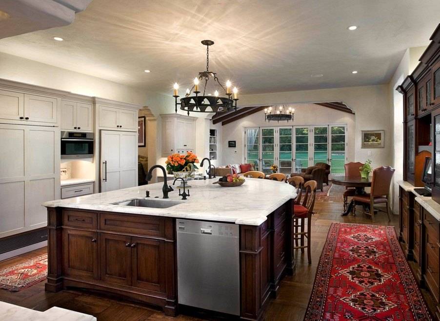 Островная тумба внушительных размеров с основанием из натурального дерева и мраморной столешницей — вот классический пример оформления острова для кухни в традиционном или классическом стиле. Модуль размещается посередине комнаты, над ним может быть расположена вытяжка или красивая хрустальная люстра. В интерьере преобладают чёрно-белые, серые, коричневые и бежевые оттенки. Ярким акцентом в просторной кухне может стать остров с тёмно-бордовой или красной столешницей.