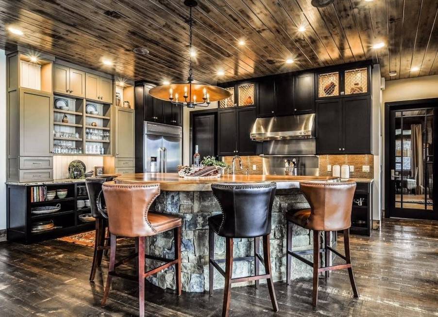 Стиль кантри — это прежде всего натуральные материалы и цвета. В такой кухне грубоватая деревянная тумба в качестве острова выглядит как нельзя лучше. Мебель можно искусственно состарить, придав ей винтажности. В идеале она должна быть без какого-либо покрытия. Кованые предметы декора и фурнитура преобладают в таком интерьере.