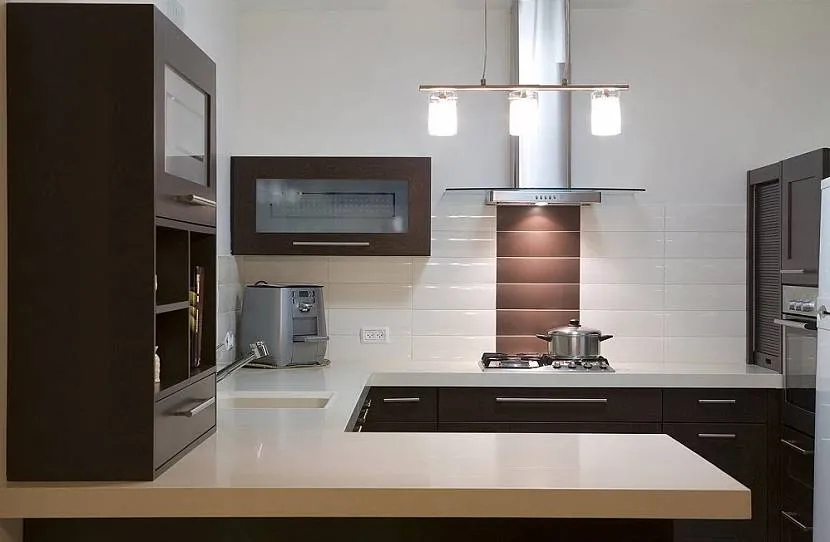 - прямым. В таком случае, он является продолжением острова и подходит для вытянутых помещений;