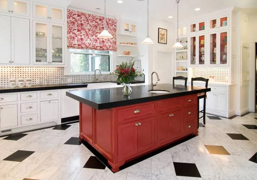 Если стиль у острова и стиль всей кухни должен совпадать, то о цвете так можно не думать. Темную и мрачную кухню можно разбавить ярким и насыщенным островком.