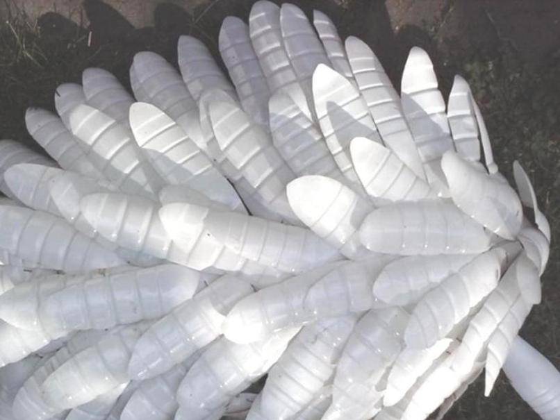 - Оперение вырезают из белых бутылок в соответствии с изображением. Из одной емкости получается три детали. Потребуется примерно 15 бутылок.