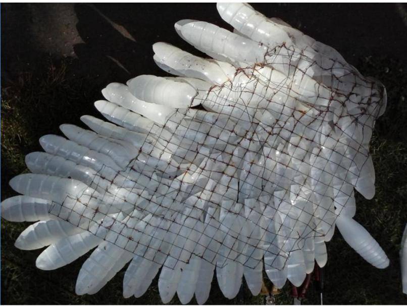 Два крыла птицы изготовлены из пластиковых перьев, закрепленных на каркасе из сетки. Перья могут иметь форму, как представлено ниже. Их крепят к сетке отрезками тонкой медной проволоки через отверстия в заготовках. Крылья крепят к шине проволокой.