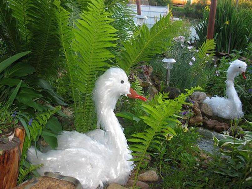 Невероятно красивыми и объемными получаются лебеди, изготовленные из полиэтиленовых пакетов. Для начала подготавливается основа, каркас, на который крепятся порезанные полосы пакета одного цвета. Цветом выделяются глаза и клюв лебедя. Отдельного внимания заслуживает изготовление поделок из гипса, который в условиях правильной эксплуатации является экологическим, прекрасным средством для украшения сада.