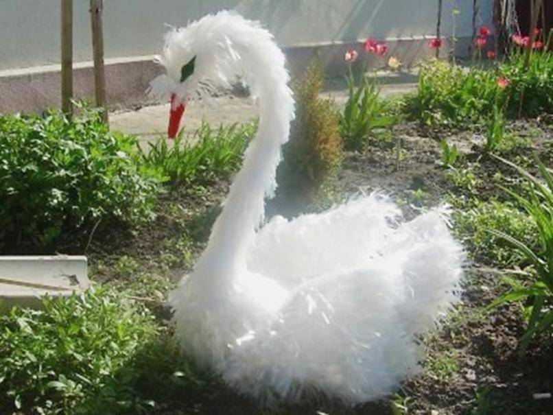 Хорошо бы, конечно, иметь на своем участке прекрасное озеро с белыми и черными лебедями. Тихим теплым вечером можно включить подсветку, музыку Чайковского…. Однако говорят, что лучше иметь синицу в руках, чем журавля в небе. К лебедю это тоже относится, так что при определенном старании своими руками из пластиковых бутылок можно сотворить почти живую гордую птицу в своем саду.