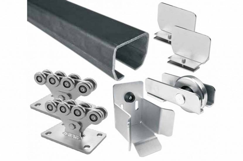 Все остальные комплектующие для откатных ворот практически не несут силовых нагрузок и служат для удерживания полотна ворот от раскачиваний. Все эти комплектующие для откатных ворот изображены ниже. Из них, поддерживающая шина (кронштейн квадратный с двумя резиновыми роликами), улавливатель нижний и улавливатель верхний — монтируются на столбы.