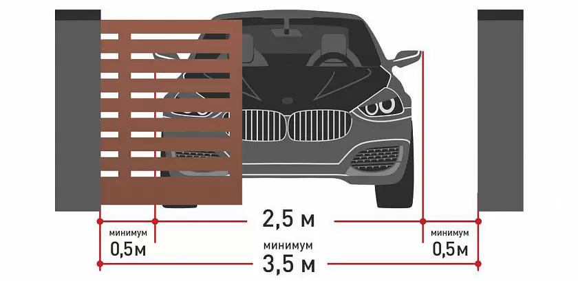 - свободный зазор между габаритной шириной авто и опорами ворот, который должен составлять 0.3–0.5 м с каждой стороны.