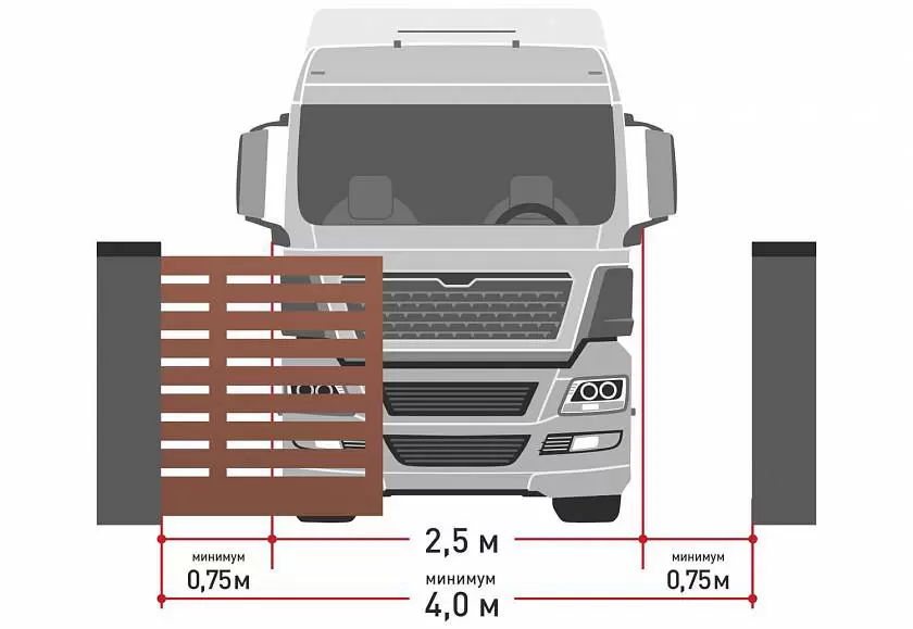 Если же движение перпендикулярно линии ограждения затруднено и потребуется въезд под углом, то это значение необходимо увеличить ещё в 1.5 раза. А ведь надо учесть ещё и то, что машина по какой-либо причине (скользкая поверхность, неопытный водитель, неправильно закреплённый груз) может сместиться или наклониться в сторону. Поэтому оптимальной можно считать ширину створа ворот около 4.5 м — этого будет достаточно для любых ситуаций.