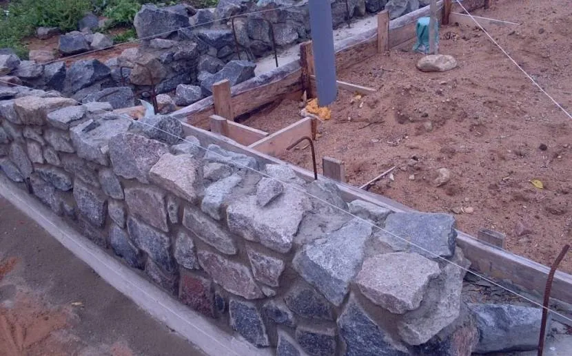 По сути, фундамент строится из так называемого бутобетона. Камень – материал прочный, не поддающийся сильному воздействию воды и влаги, так что такой фундамент простоит долго. Единственное надо знать, что лучше использовать камень с острыми краями, неровными плоскостями, впадинами, бугорками и прочими неровностями. Поэтому крупная речная галька здесь не подойдет. И еще один момент – повысить прочность поможет кладочный бетонный раствор марки не ниже М200.