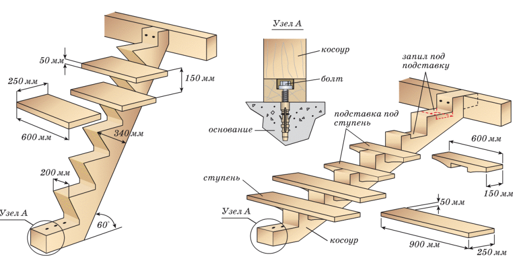 Косоуры: узлы их примыкания и схемы крепления ступеней