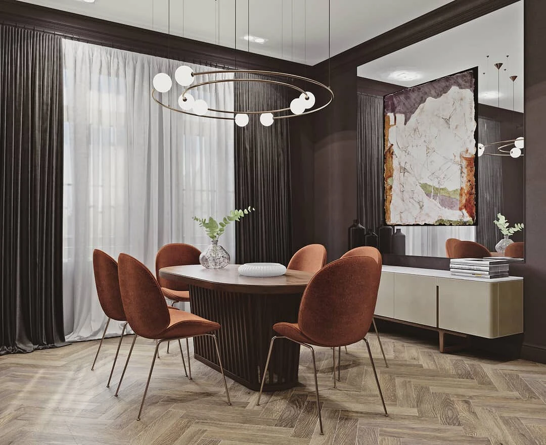 Если вам нравятся плоские плафоны, подумайте о дополнительной подсветке. Для большого помещения сложно найти красивую небольшую люстру такого типа. А вот в сочетании с несколькими точечными светильниками она будет выглядеть эффектно и обеспечит отличное освещение.