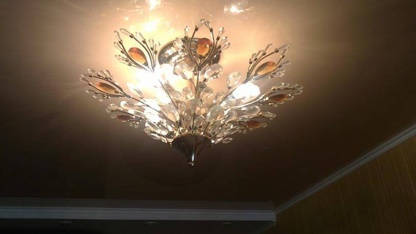 Обязательно учтите, что свет будет бликовать на потолке, а сама люстра отразиться в нем.