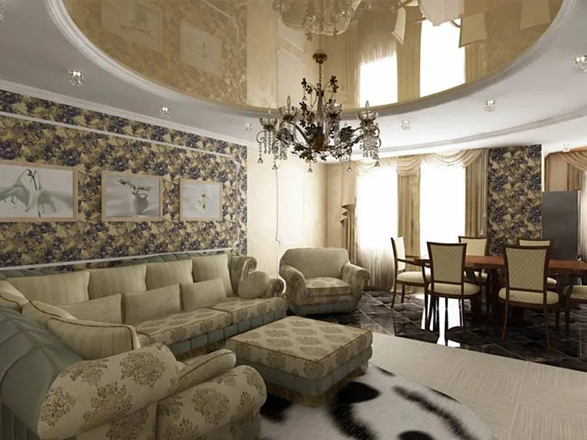 Если вы выбрали для потолка в гостиной натяжное покрытие, необходимо особенно тщательно подойти к подбору люстры. В целях безопасности не забывайте об упомянутых выше рекомендациях. Впрочем, эстетические качества не менее важны, поэтому давайте сосредоточимся на них.