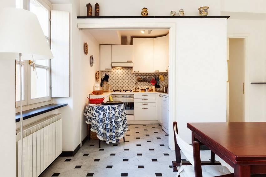 С целью экономии места на кухне обычную распашную дверь на входе могут заменить раздвижные или складные двери, видов которых сейчас существует предостаточно. Еще один вариант – обойтись и вовсе без двери, но в этом случае вы должны позаботиться о мощной вытяжке, которая тоже, кстати, бывает выдвижной.