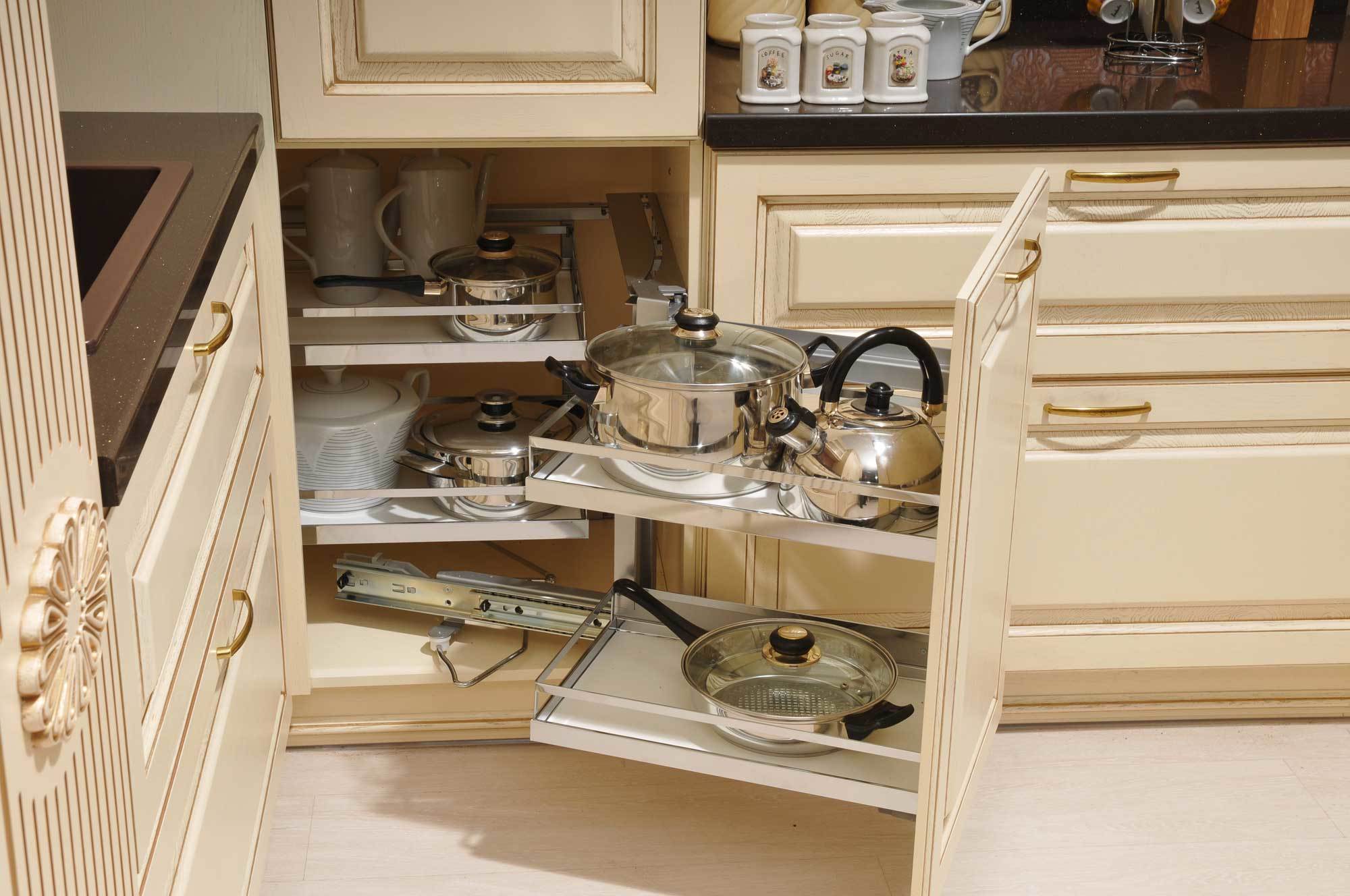 Угловые шкафы также являются хорошим местом для хранения большого оборудования и посуды. При условии, однако, что и здесь вы позаботитесь о сборке выкатных систем