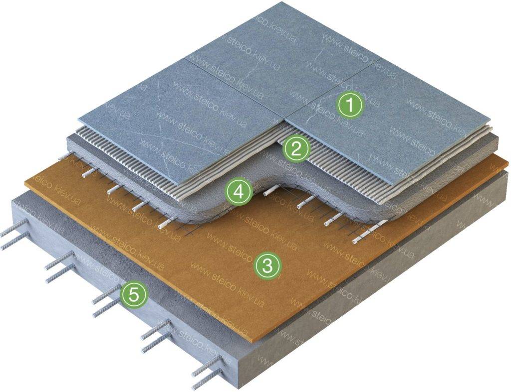 Схема утепления пола с МДВП: 1. Напольное покрытие (плитка); 2. Плиточный клей; 3. STEICO STANDART; 4. Стяжка пола с подогревом; 5. Плита перекрытия.