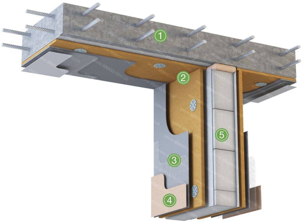 Схема утепления стены с МДВП: 1. Плита перекрытия; 2. STEICO STANDART; 3. Штукатурка по сетке; 4. Обои или краска; 5. Наружная стена.