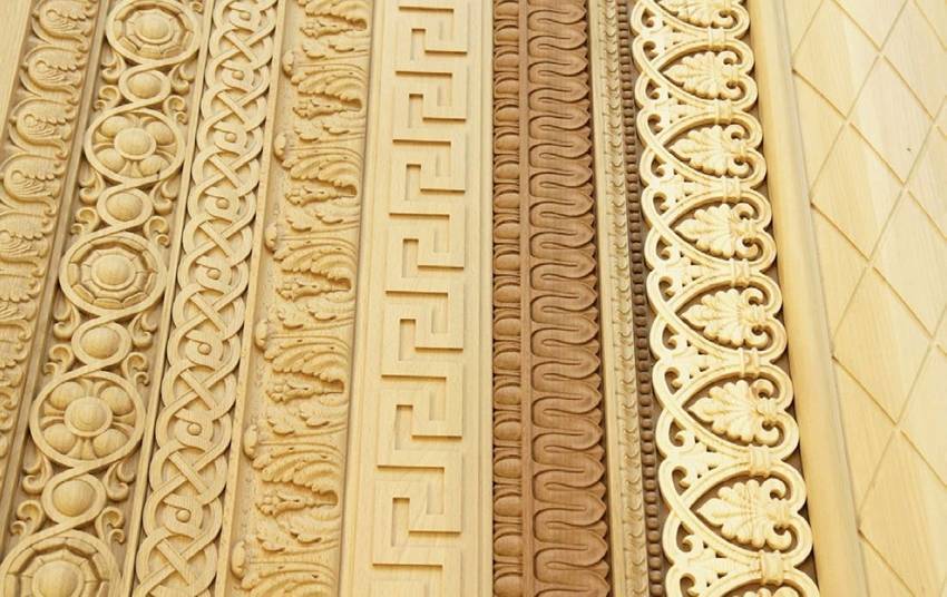 Украсить дверной проем можно не только с использованием капителей и карниза, возможны и другие варианты декорирования. Наиболее популярный из них – это оформление дверей резными планками. Как можно увидеть на фото, наличники на двери с резьбой – это деревянные планки, которые могут быть как плоскими, так и выпуклыми по форме, однако с характерными закругленными краями, которые украшенные узором, вырезанным на дереве.