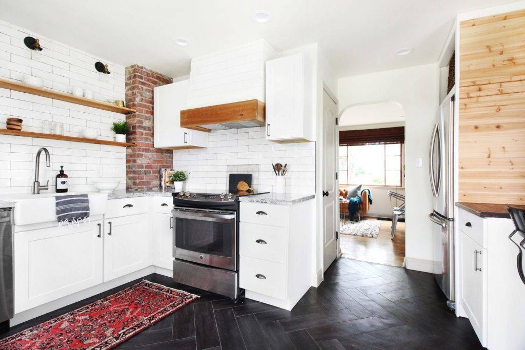 Сочетание белого с деревом прекрасно впишется в скандинавский стиль. В такой кухне будет тепло и уютно даже в холодный зимний день. Дополнение чистого белого металлом создает обратный эффект: кухня становится холоднее, но у нее появляется особый шарм.