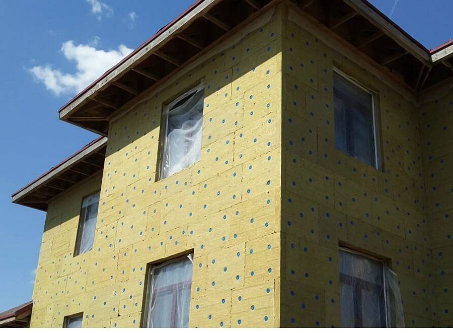 - Сначала монтируется утеплитель на стены на клей и фасадные дюбеля.